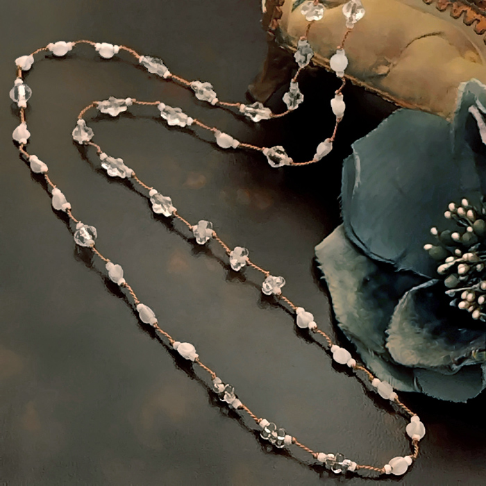 フランスで買い付けたビンテージと現代のガラスビーズをミックスして華奢なラインに仕上げたグリフィン糸で作るロングネックレス。