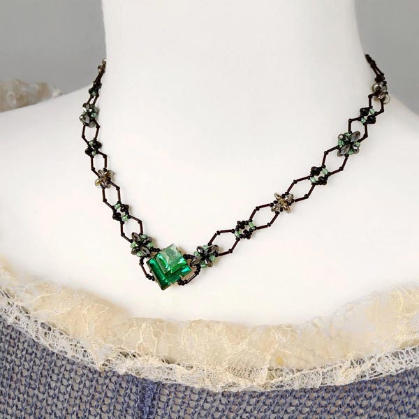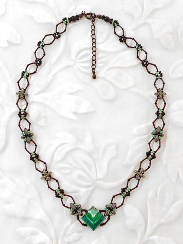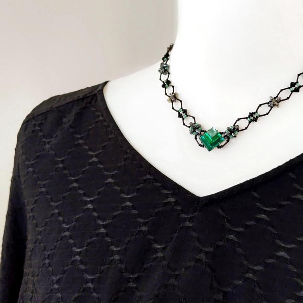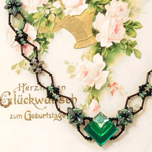 ネックレスキット [N25-O-G] 中心の四角パーツはフランスで買い付けたビンテージ。デザイン性のある形と光の当たり方で微妙に濃淡が変わる色合いも魅力的です。首回りは四角パーツに合わせてひし形が連なるようなラインを竹ビーズで作るパターンにしました。着用するとV字になる仕上りで首元をシャープに見せてくれます。仕上り 約37〜41.5cm(テール使用)中心のガラス四角パーツ 1辺 約1.2cm他 ヘマタイト・ガラスビーズ・メタル金具テグス使用 ネックレスキット [N25-O-G] 販売価格: 4,950円(税込) 数量: 1 2 返品特約に関する重要事項 お問い合わせ 別のアングルから 撮影時の照明や自然光の影響、 お使いのパソコンのディスプレイの違いや照明により 実物と色味や質感に多少の差異がある場合がございますので、ご了承ください。
